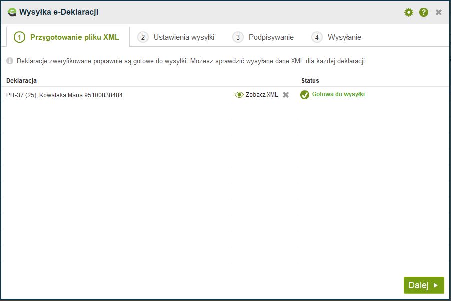 Po kliknięciu na “Wyślij e-Deklarację”, otworzy się okno przygotowania pliku XML do wysyłki. Gdy plik XML jest gotowy klikamy “Dalej”.