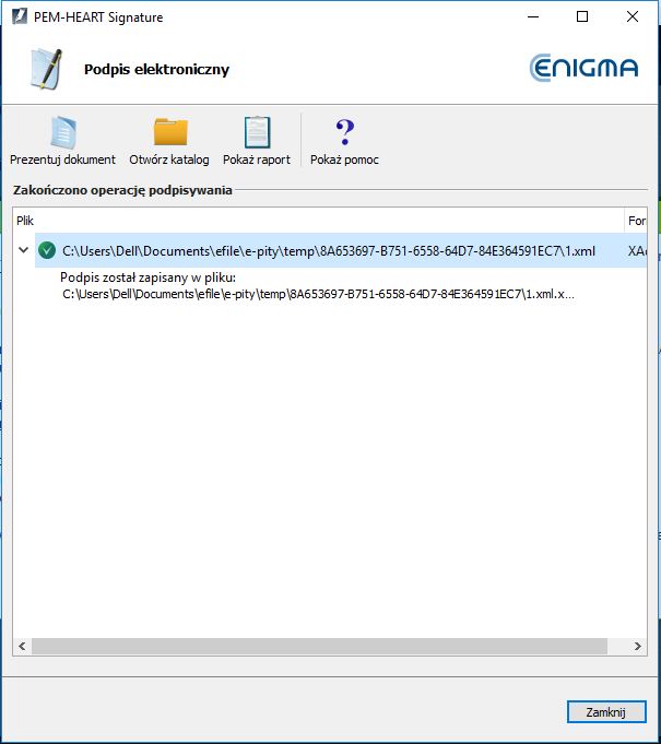 W tym momencie plik XML zostanie sygnowany podpisem elektronicznym i w katalogu utworzy się podpisany plik o rozszerzeniu *.xml.XADES