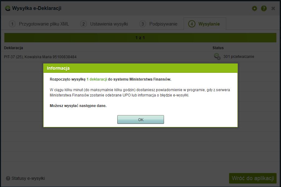 Klikamy “OK” i wracamy do aplikacji. Wysyłana e-deklaracja jest aktualnie w trakcie przetwarzania - pojawił się przy niej status 301. Po jej pomyślnej weryfikacji deklaracja otrzyma status 200 i w programie zostanie do niej odebrane UPO (Urzędowe Poświadczenie Odbioru).