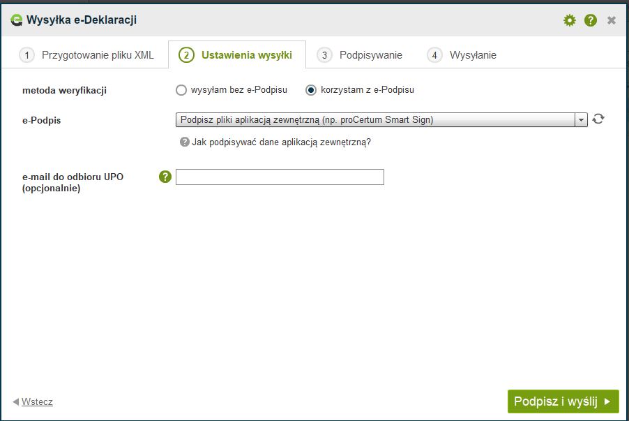 W polu “e-Podpis” wybieramy “Podpisz pliki aplikacją zewnętrzną (np. proCertum Smart Sign) ”, następnie klikamy na dole na przycisk “Podpisz i wyślij”.