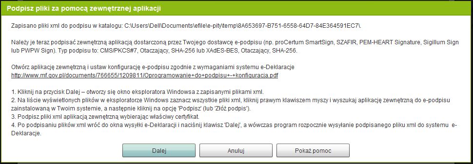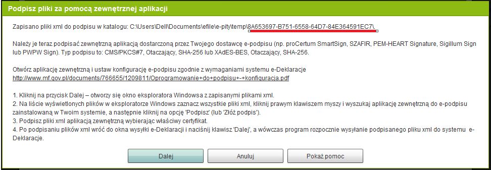 Pojawi się komunikat z instrukcją jak należy podpisać plik aplikacją zewnętrzną. W tym momencie przygotowany plik XML został zapisany w konkretnej lokalizacji na komputerze - zapamiętujemy końcówkę numeru katalogu - w tym przypadku ‘91EC7’.