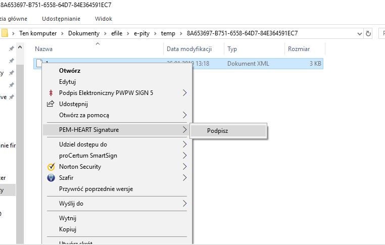 Jeśli pracujemy na Systemie Windows postępujemy zgodnie instrukcją, która pojawiła się w programie e-pity - klikamy na przycisk ‘Dalej’ wówczas w Ekploratorze Windows otworzy się katalog, w którym zapisał się nasz plik XML, będzie można prawym przyciskiem myszy na niego kliknąć, wybrać program PEM-HEART Signature i kliknąć na opcję ‘Podpisz’. Zapisany plik XML otworzy się w aplikacji zewnętrznej i będzie można go podpisać swoim certyfikatem.