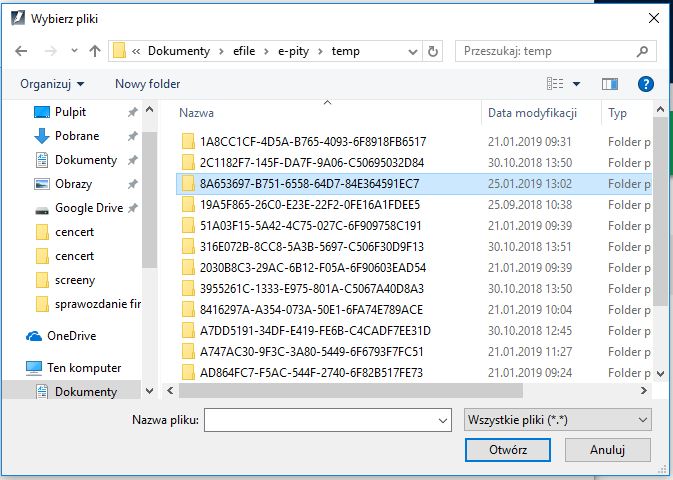 wyszukujemy lokalizację ‘Nazwa Użytkownika komputera’ -> Dokumenty -> efile -> epity -> temp, a następnie wyszukujemy nazwę folderu z wcześniej zapamiętaną przez nas końcówką numeru ‘...91EC7" i otwieramy ten folder,