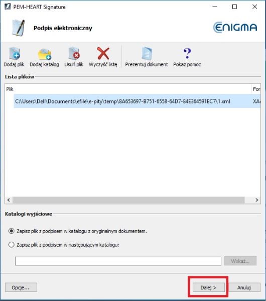 Gdy zakończy się operacja podpisywania pliku xml wracamy do zminimalizowanego okna programu e-pity i klikamy na ‘Dalej’.