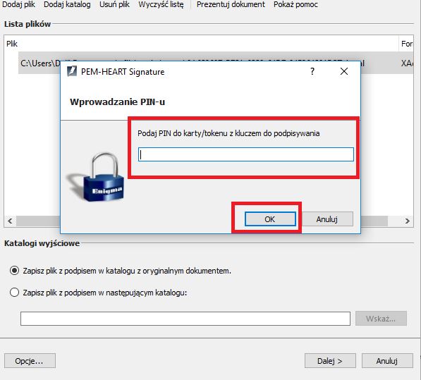 W następnym oknie wprowadzamy kod PIN do swojego e-podpisu i podpisujemy plik XML.