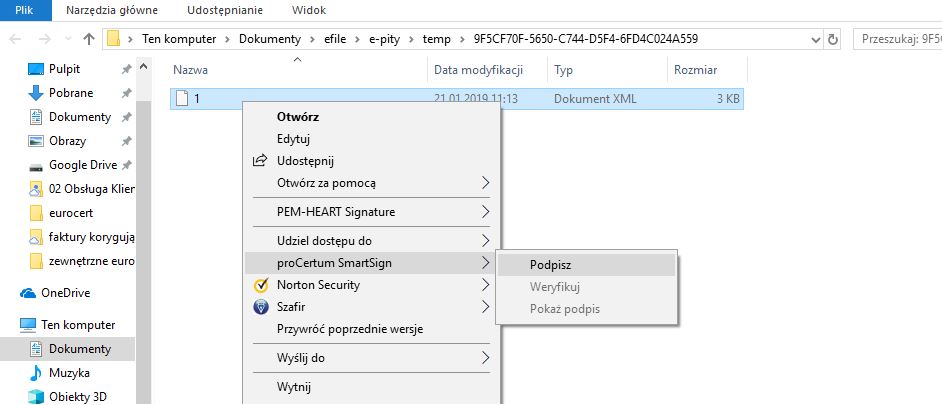 Jeśli pracujemy na Systemie Windows postępujemy zgodnie instrukcją, która pojawiła się w programie e-pity - klikamy na przycisk ‘Dalej’ wówczas w Ekploratorze Windows otworzy się katalog, w którym zapisał się nasz plik XML, będzie można prawym przyciskiem myszy na niego kliknąć, wybrać program proCertum Smart Sign i wybrać opcję ‘Podpisz’. Zapisany plik XML otworzy się w aplikacji zewnętrznej i będzie można go podpisać swoim certyfikatem.