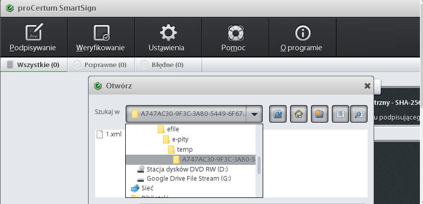 Możemy też skopiować całą lokalizację pliku z okna z komunikatem w programie e-pity i wkleić w aplikacji proCertum Smart Sign w polu Nazwa pliku, wówczas ten plik XML się nam sam wyszuka (niestety nie na wszystkich urządzeniach działa opcja kopiuj - wklej w aplikacji proCertum Smart Sign).