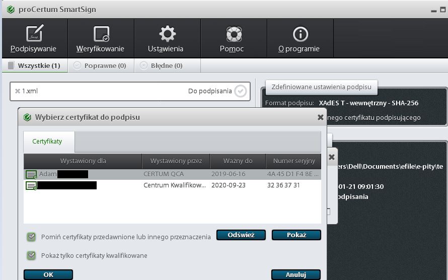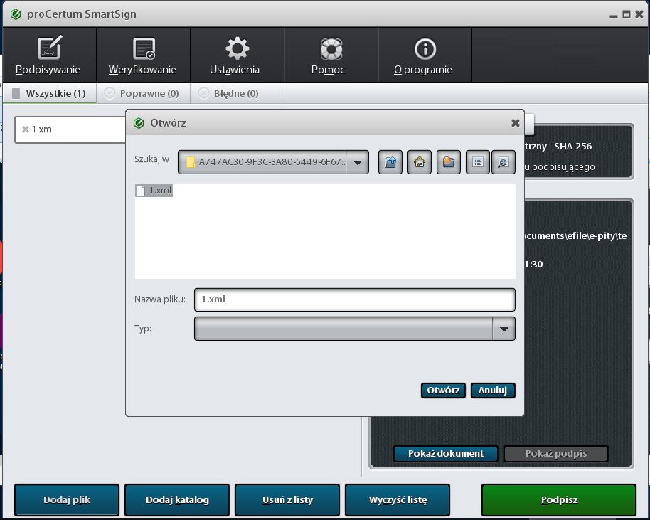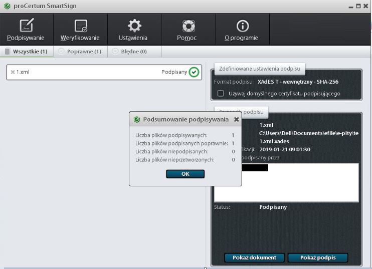 W tym momencie plik XML zostanie sygnowany podpisem elektronicznym i w katalogu utworzy się podpisany plik o rozszerzeniu *.xml.XADES