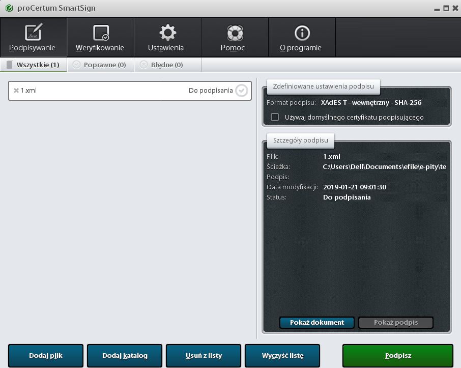 Po wczytaniu pliku XML do podpisania klikamy w przycisk “Podpisz”