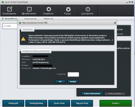 Wprowadzamy kod PIN do swojego e-podpisu i podpisujemy plik XML.