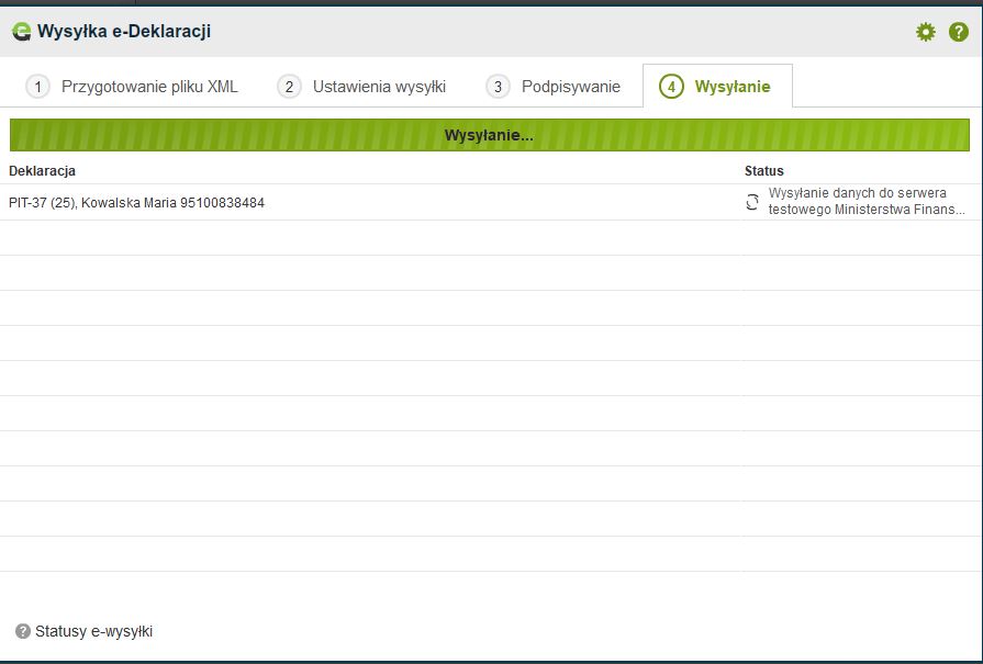 Kliknięcie “Dalej” spowoduje rozpoczęcie wysyłki podpisanego pliku XML do serwera Ministerstwa Finansów.