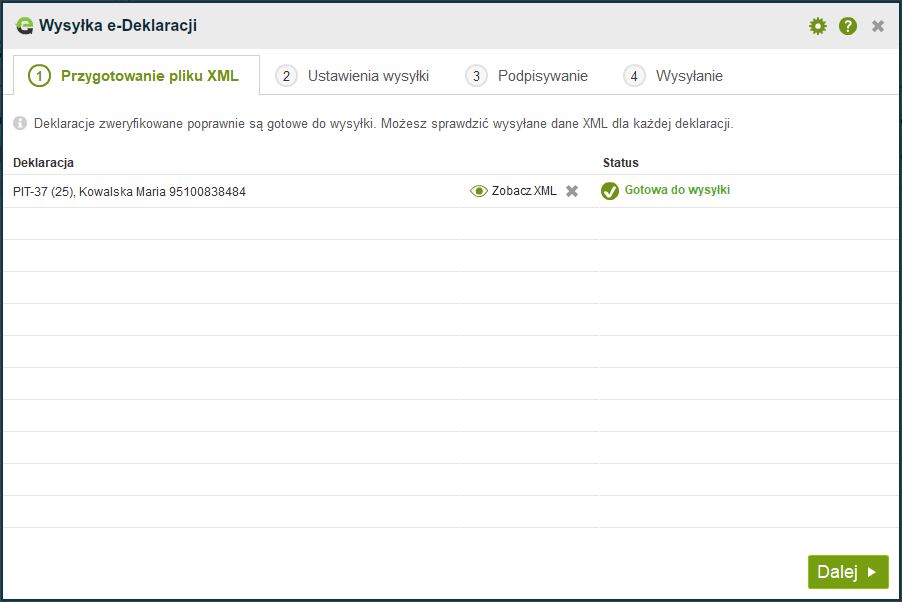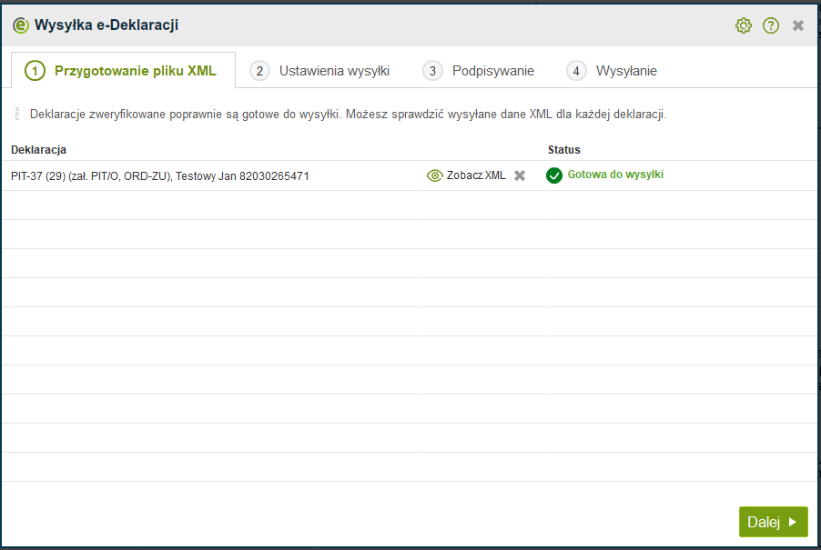 Po kliknięciu na “Wyślij e-Deklarację” otworzy się okno przygotowania pliku XML do wysyłki. Gdy plik XML jest gotowy klikamy “Dalej”