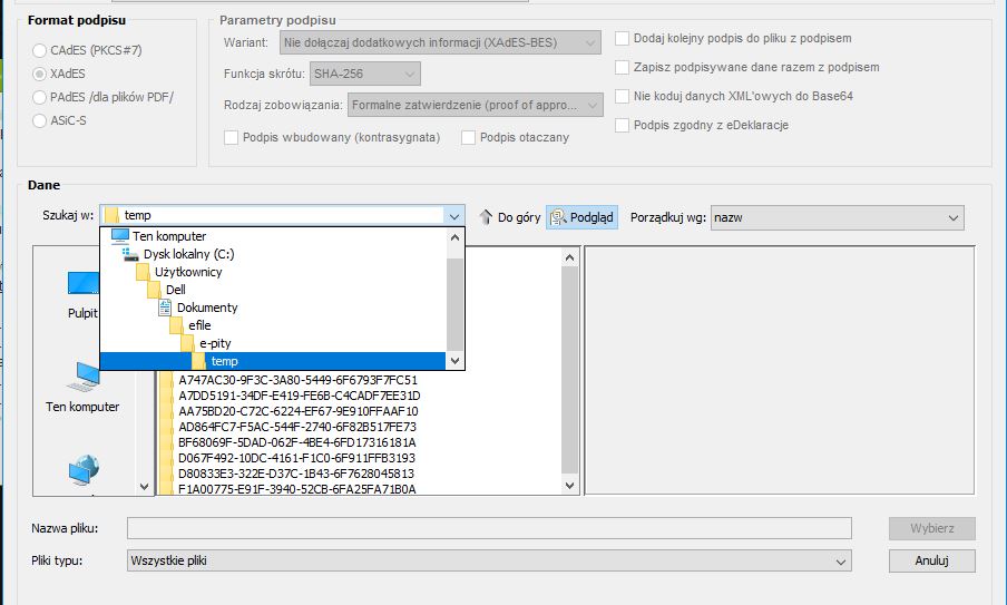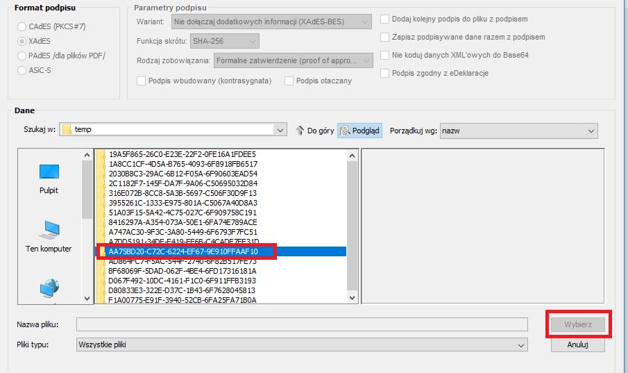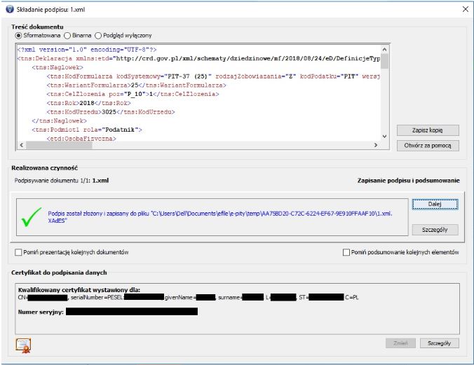 W tym momencie plik XML zostanie sygnowany podpisem elektronicznym i w katalogu utworzy się podpisany plik o rozszerzeniu *.xml.XADES