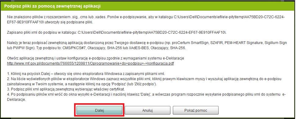 Po pojawieniu się informacji “Podpis został złożony i zapisany do pliku (....)” wracamy do zminimalizowanego okna programu e-pity i klikamy na przycisk ‘Dalej’.