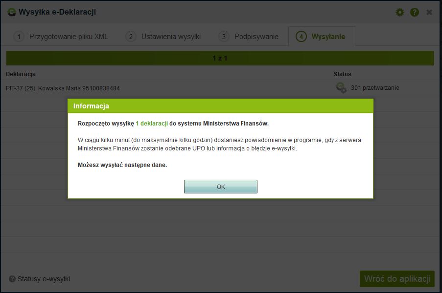 Klikamy “OK” i wracamy do aplikacji. Wysyłana e-deklaracja jest aktualnie w trakcie przetwarzania - pojawił się przy niej status 301. Po jej pomyślnej weryfikacji deklaracja otrzyma status 200 i w programie zostanie do niej odebrane UPO (Urzędowe Poświadczenie Odbioru).