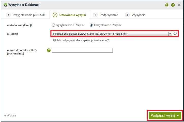 W polu “e-Podpis” wybieramy “Podpisz pliki aplikacją zewnętrzną (np. proCertum Smart Sign) ”, następnie klikamy na dole na przycisk “Podpisz i wyślij”.