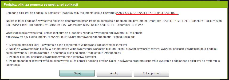 Pojawi się komunikat z instrukcją jak należy podpisać plik aplikacją zewnętrzną. W tym momencie przygotowany plik XML został zapisany w konkretnej lokalizacji na komputerze - zapamiętujemy końcówkę numeru katalogu - w tym przypadku ‘FAAF10’.