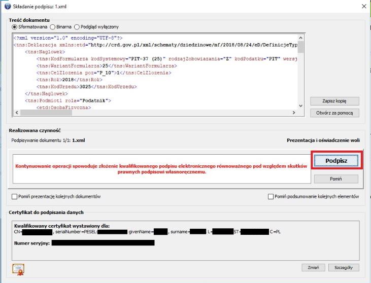 Wprowadzamy kod PIN do swojego e-podpisu i podpisujemy plik XML.