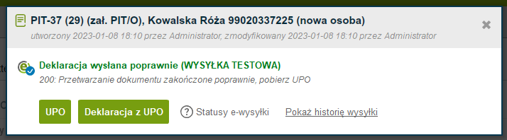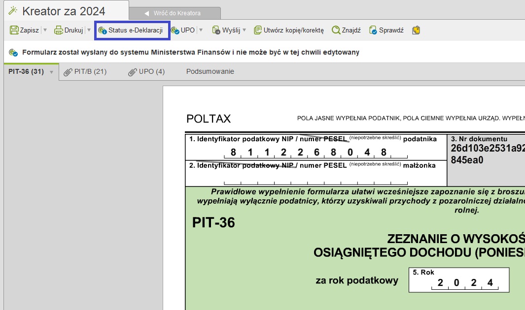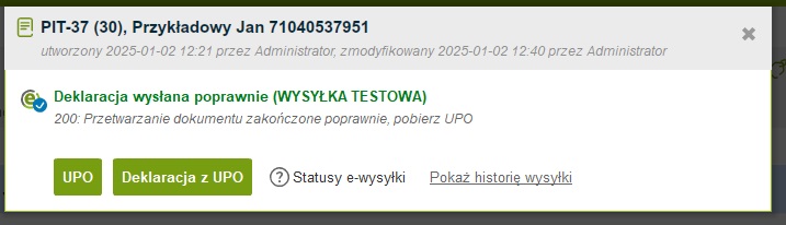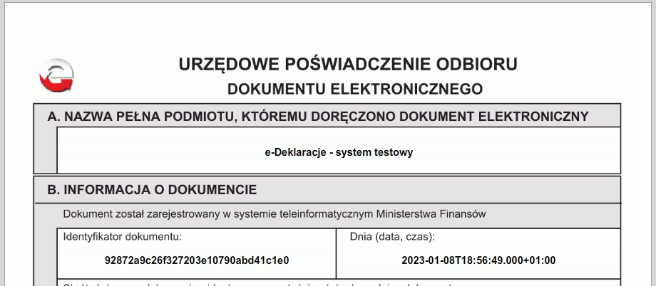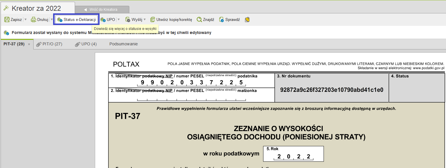 Po pomyślnej wysyłce deklaracja otrzymuje status 200 i odbierane jest do niej potwierdzenie wysyłki UPO, a numer referencyjny (identyfikator dokumentu) z odebranego UPO wkleja się do głównej deklaracji do pola nr dokumentu.