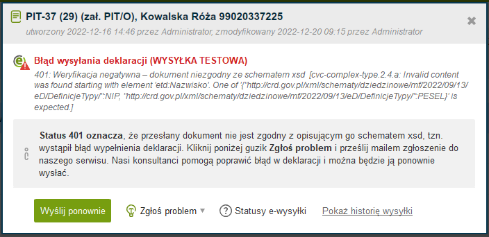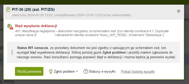 Z poziomu tego okna można po błędnej wysyłce kliknąć na dole w Statusy e-Deklaracji, aby sprawdzić na czym polega błąd wysyłki. Przy niektórych błędach wysyłki w tym oknie pojawi się również przycisk 'Zgłoś problem', dzięki któremu można wysłać zgłoszenie błędnego statusu do naszego serwisu. Po otrzymaniu zgłoszenia postaramy się pomóc odszukać błąd w e-deklaracji i będzie można ją poprawić i ponownie wysłać.